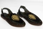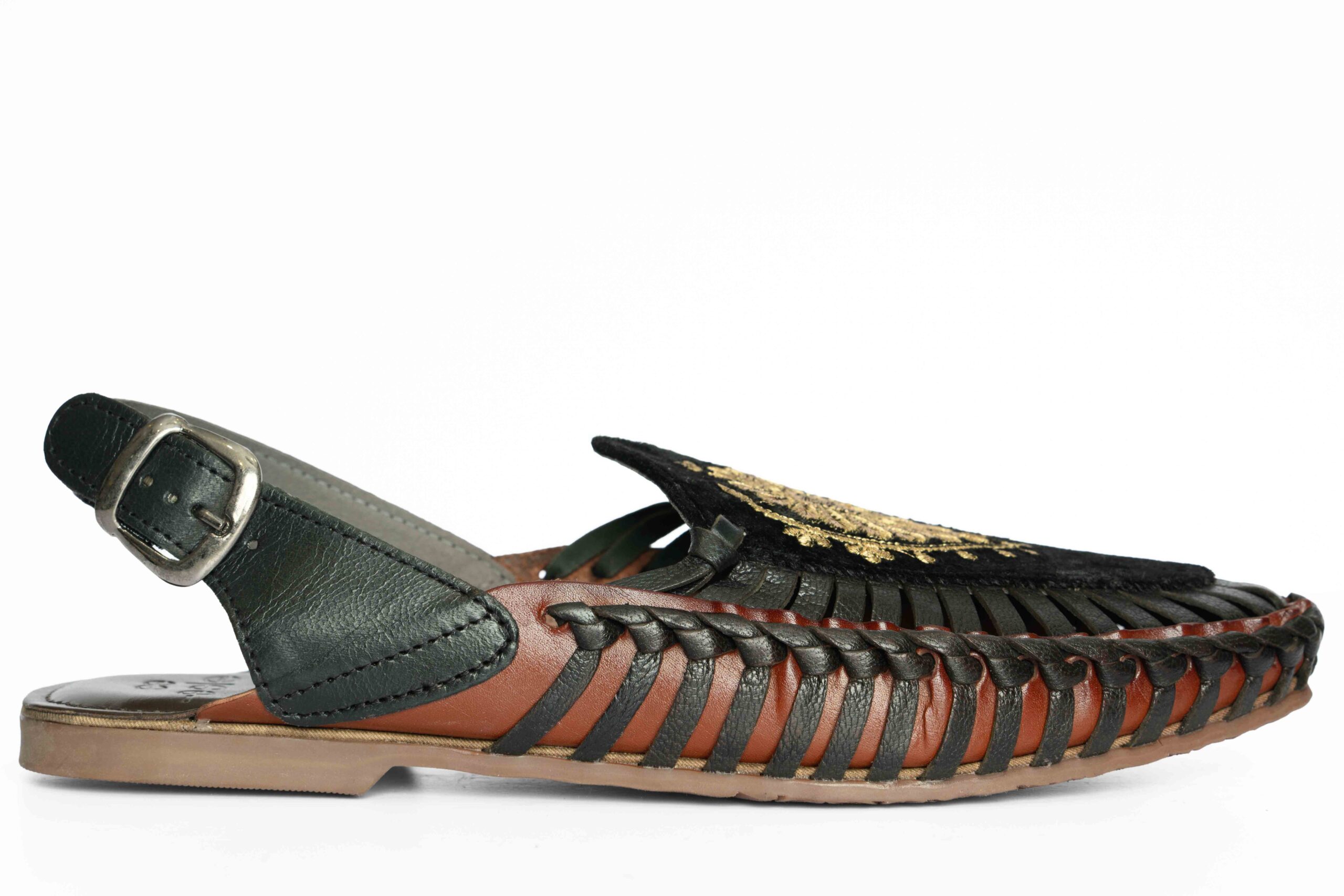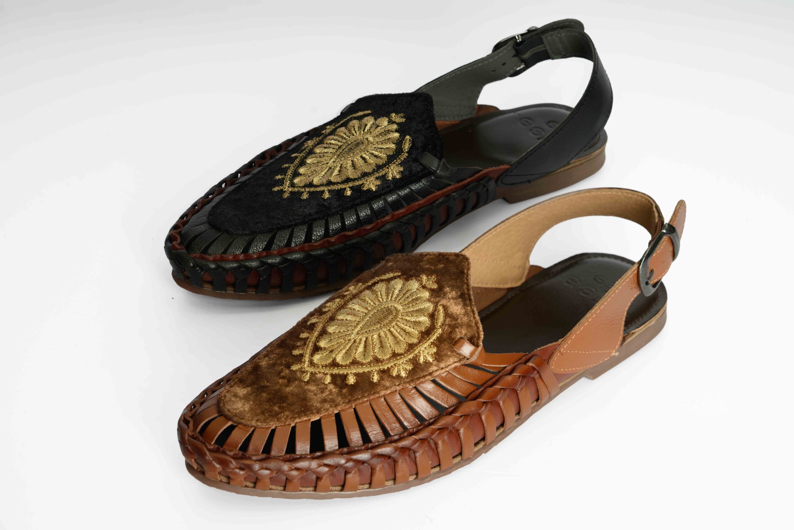 Handcrafted Leather Sandals With Embroidered Velvet Overlay